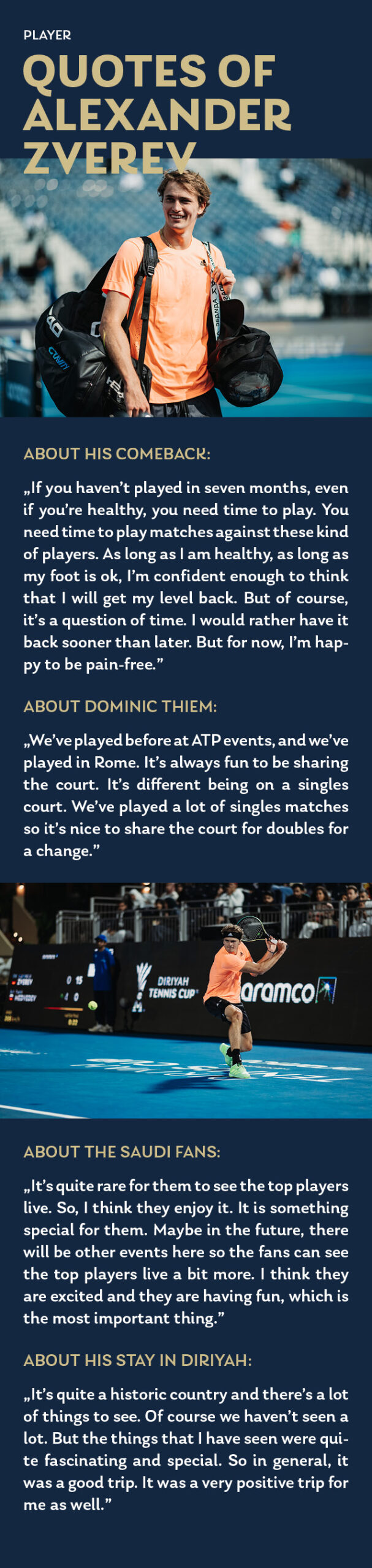 Der Diriyah Tennis Cup ist ein exklusives Einladungsturnier, das einige der besten Tennisspieler der Welt in Saudi-Arabien vereint. Vor der eindrucksvollen Kulisse der UNESCO-Weltkulturerbestätte Diriyah trifft sportliche Spitzenleistung auf internationale Strahlkraft. Das Event steht für höchste sportliche Qualität, weltweite Aufmerksamkeit und die Verbindung von Tradition, Gastfreundschaft und moderner Sportkultur.